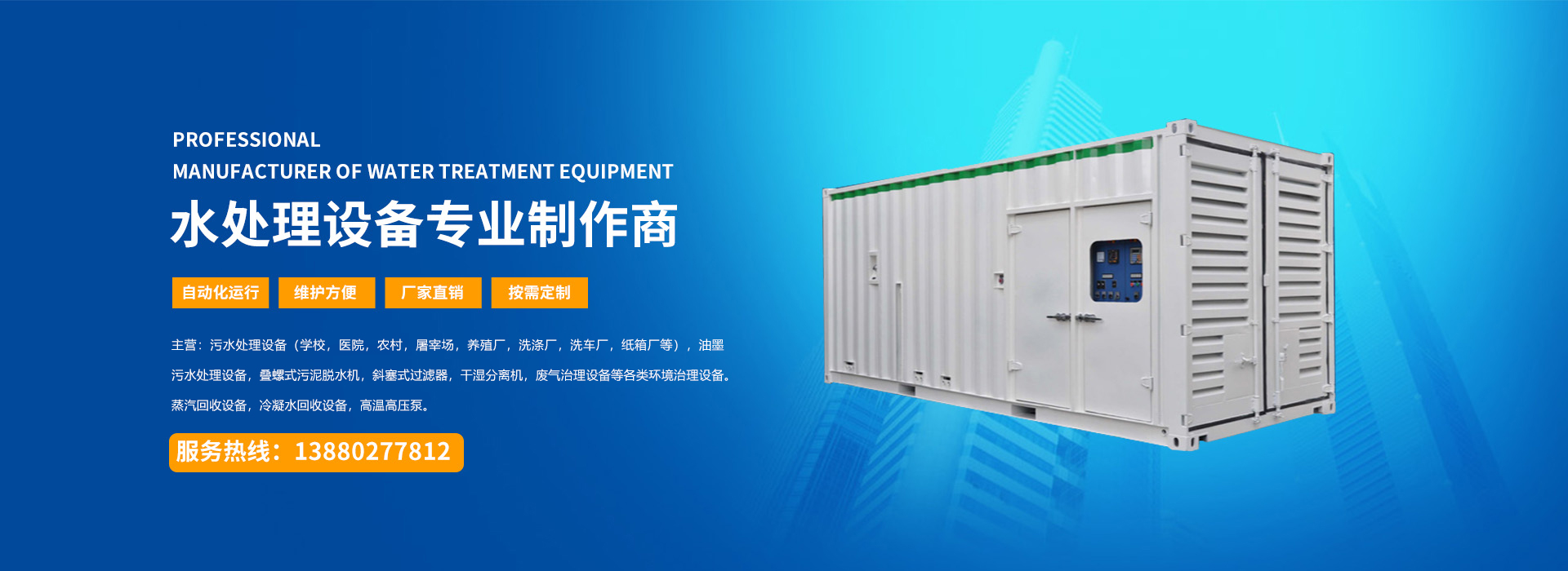 四川宇藍環(huán)保工程有限公司是水處理設備及各類環(huán)境治理設備的生產(chǎn)廠家并承接各類環(huán)境治理設備的工程項目。 公司專門從事各類環(huán)境治理設備及冷凝水蒸汽回收設備的開發(fā)、設計、制造、銷售以及技術服務的綜合性公司,主要產(chǎn)品有:污水處理設備(學校,農(nóng)村,屠宰場,養(yǎng)殖場,醫(yī)院,小區(qū),紙箱廠,洗滌廠等),油墨污水處理設備,疊螺式污泥脫水機,斜塞式過濾器,干濕分離機,廢氣治理設備等各類環(huán)境治理設備以及蒸汽回收設備,冷凝水回收設備,高溫高壓泵等各類節(jié)能減排的節(jié)能設備。 ...